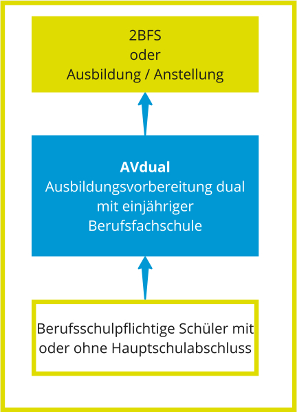 Die AV dual stellt individualisiertes Lernen und eine verstärkte Einbindung von Betriebspraktika in den Vordergrund. Es wendet sich an Jugendliche, die im Anschluss an die allgemeinbildende Schule noch Förderbedarf haben, um die Ausbildungsreife zu erlangen, oder welche die Berufsschulpflicht erfüllen müssen. Zur Unterrichtsverpflichtung zählt außerdem mindestens ein wöchentlicher Praktikumstag in einem Betrieb, welcher im Idealfall in eine Ausbildungsstelle mündet. Während der Schulzeit wird Wert auf differenziertes Lernen in unterschiedlichen Niveaustufen mit intensiver Lernbegleitung und Beratung gelegt.
