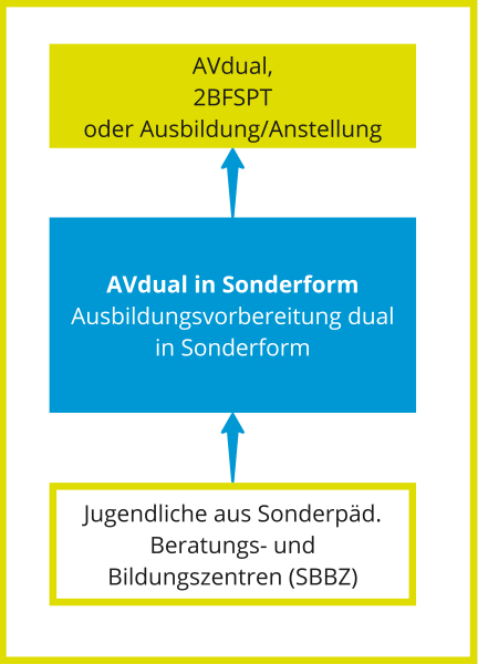 Die AVdual in Sonderform wendet sich an Schüler/-innen von sonderpädagogischen Bildungs- und Beratungszentren (SBBZ) mit der Notwendigkeit eines sonderpädagogischen Bildungsangebotes.